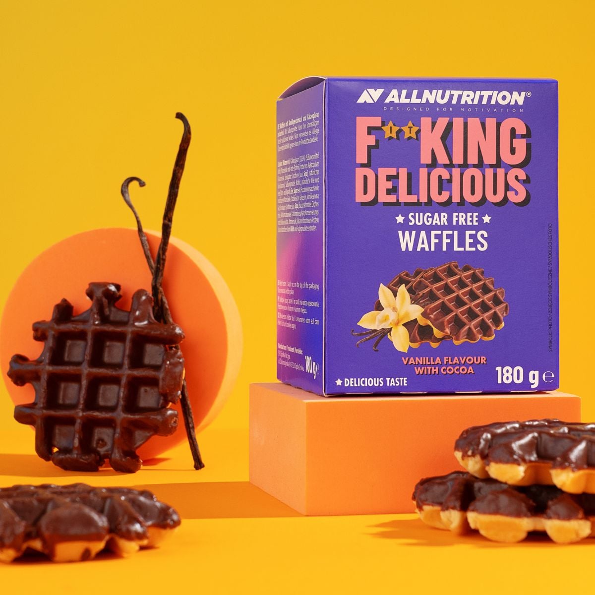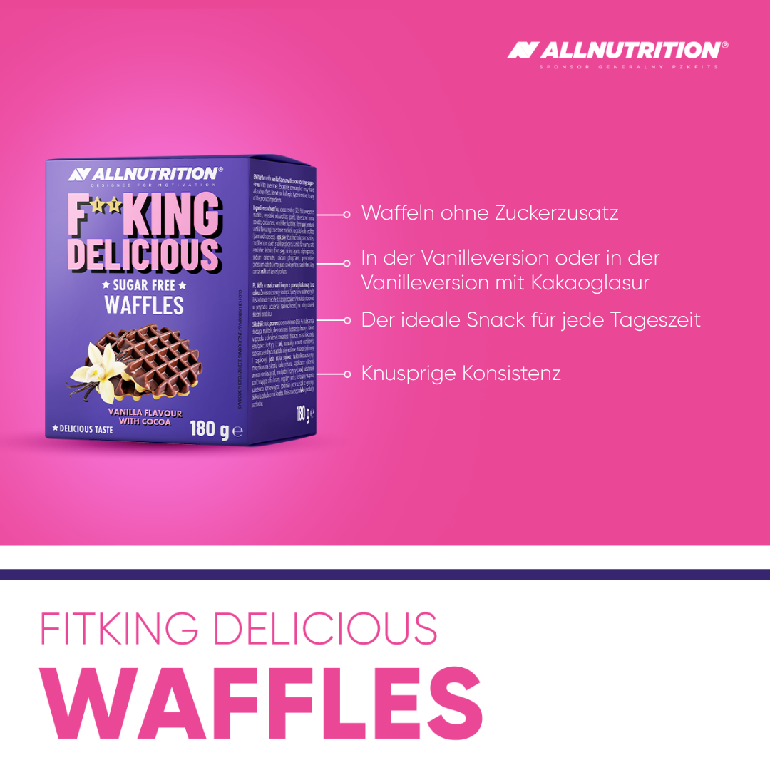 Allnutrition Fitking Delicious Waffles 180 G Vanilla Flavour With Cocoa – Waffeln mit Vanillegeschmack und Kakaoüberzug, ohne Zuckerzusatz. Köstlicher Snack für bewussten Genuss.