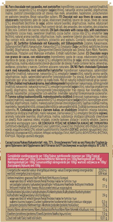 Kakaomasse, Süßungsmittel (Maltit), Kakaobutter, Kakaonibs (2%), Emulgator (Sojalecithin), natürliches Aroma: Vanille, Süßungsmittel: Steviol-Glycoside aus Stevia.