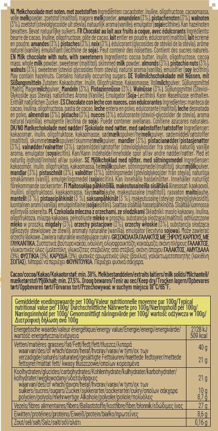 Kakaobutter, Inulin, Oligofructose, Kakaomasse, Vollmilchpulver, Süßungsmittel (Maltit), Magermilchpulver, Pistazie, Mandeln, Walnüsse, Emulgator (Sojalecithin), natürliches Vanillearoma, Süßungsmittel: Steviol-Glycoside aus Stevia.