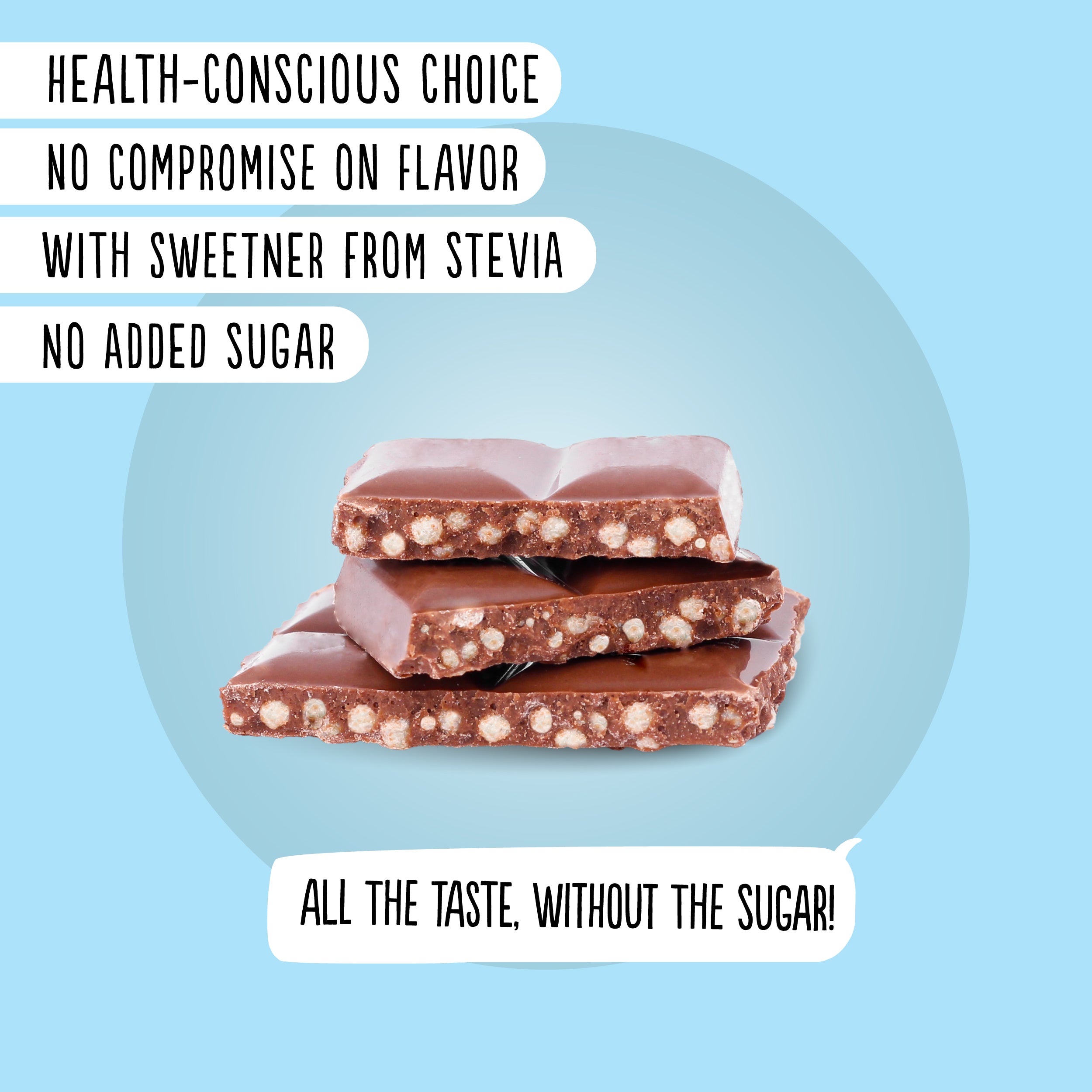 Die hochwertige Kombination aus Maltit und Stevia bietet optimale Geschmacksqualität ohne Zucker. Der fluffige Puffreis sorgt für eine leichte Textur und ein großartiges Knuspererlebnis. Diese Mischung macht die Schokolade zu einem einzigartigen Genuss.