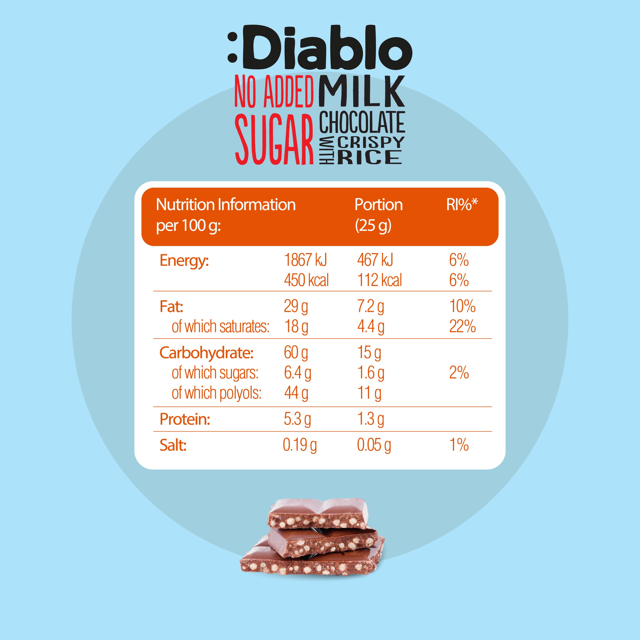 :Diablo No Added Sugar Milk Chocolate with Crispy Rice ist zartschmelzende Vollmilchschokolade mit fluffigem Puffreis. Die Schokolade ist ausschließlich mit Süßungsmitteln (Maltit, Stevia) gesüßt und frei von zusätzlichem Zuckerzusatz.