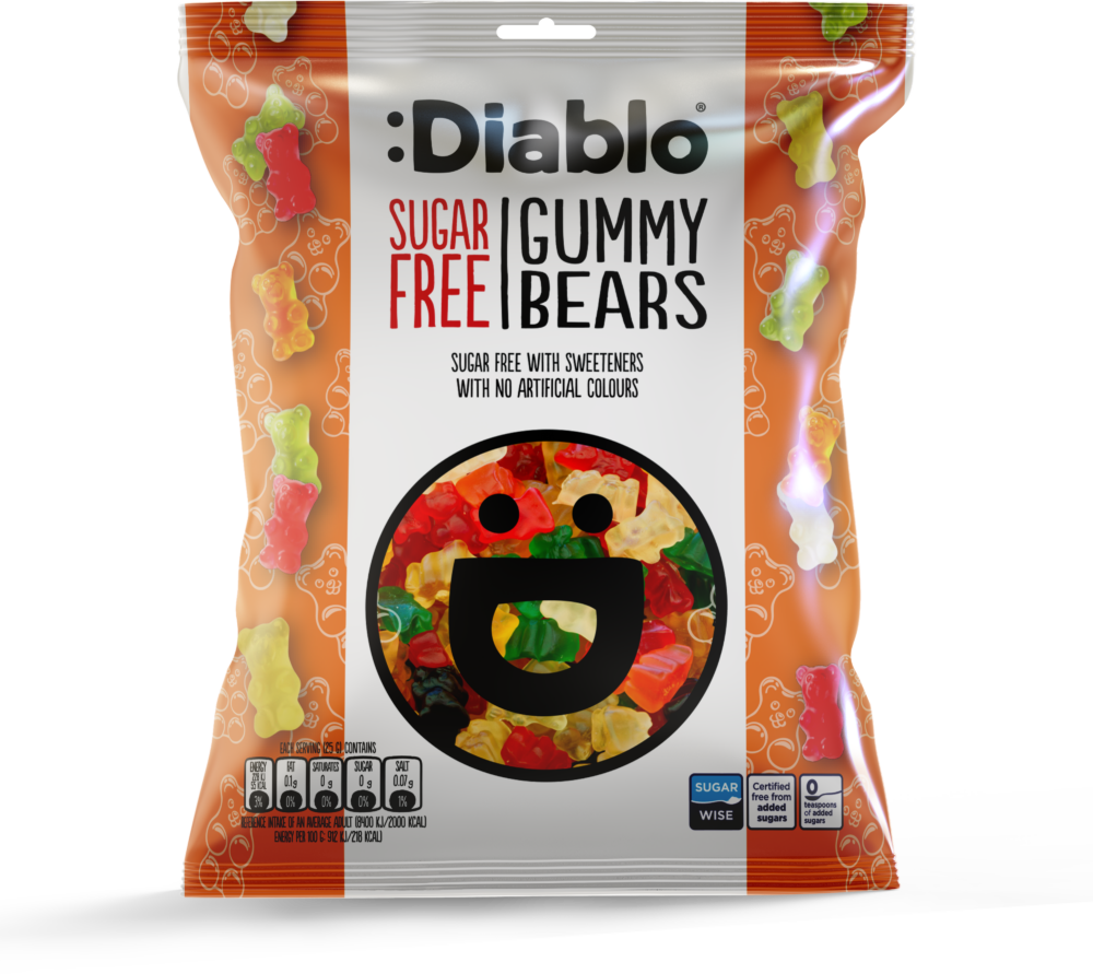 :Diablo Sugar Free Gummy Bears sind leckere Gummibärchen, nur gesüßt mit Süßungsmitteln (Maltit, Steviolglycoside, Sorbit) und ohne zusätzlichen Zuckerzusatz. Die leckeren, fruchtig bunten Gummibärchen sind die gesündere Art zu naschen für alle, die auf die Linie achten. :Diablo Gummibärchen sind zudem laktosefrei und glutenfrei.