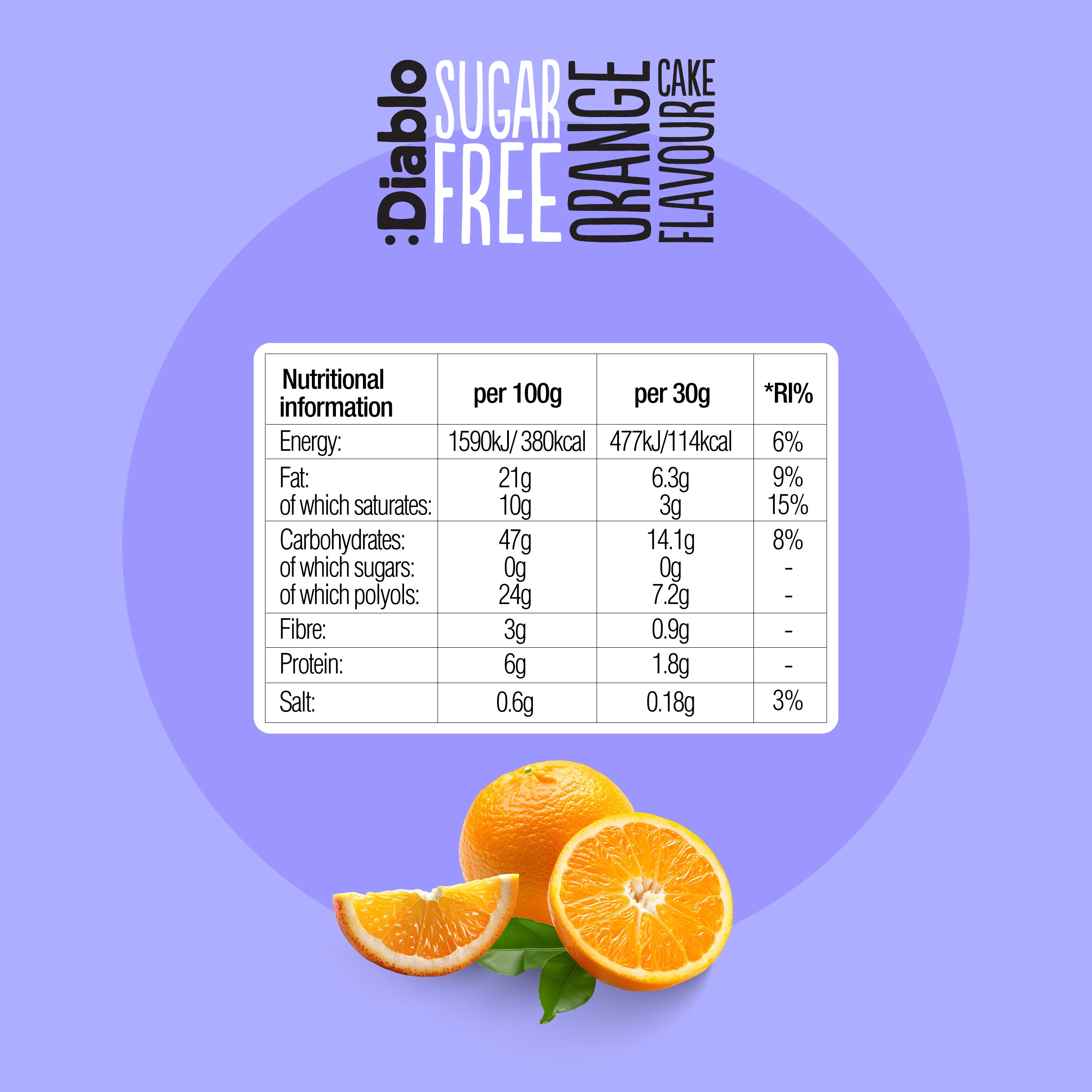 Ohne zu Backen, ist dieser fruchtige und saftige Orangenkuchen direkt bereit zum Verzehr! Die perfekte Wahl für alle Kuchenliebhaber, die auf die Linie achten und trotzdem gern Naschen wollen! :Diablo Sugar Free Orange Flavour Cake wird ausschließlich mit Süßungsmittel (Maltit) gesüßt und ohne zusätzlichen Zuckerzusatz hergestellt. Zudem ist der Kuchen laktosefrei.